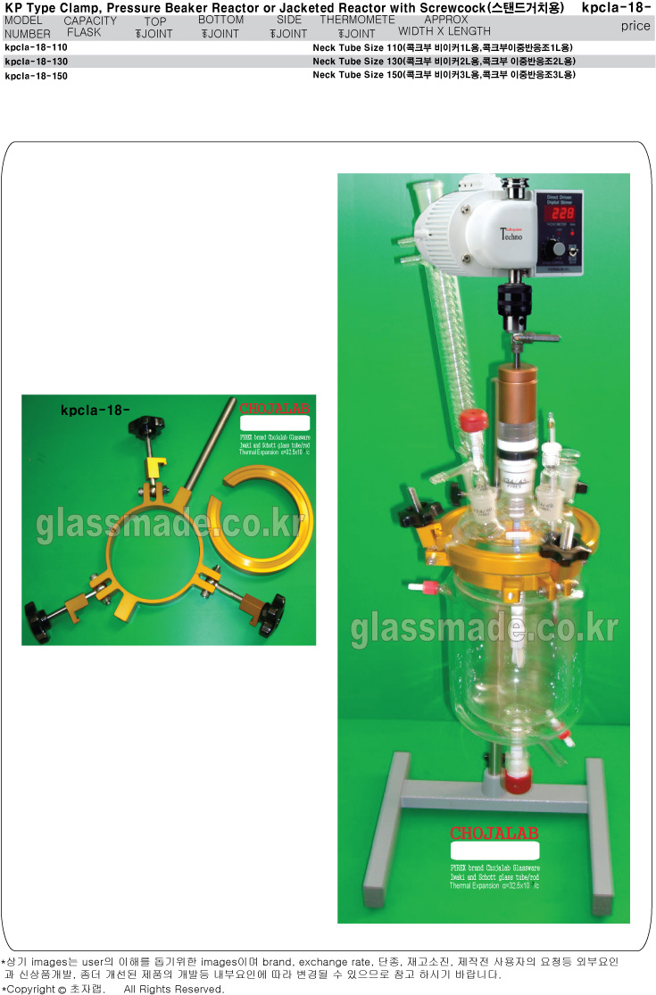 KP Type Clamp, Pressure Beaker Reactor or Jacketed Reactor with Screwcock,스탠드거치용 clamp related reactor, clamp related reactor, clamp related reactor, clamp / stand / support jack 제조회사: chojalab 모델명: kpcla-18 브랜드: glassmade 원산지: korea 특이사항: