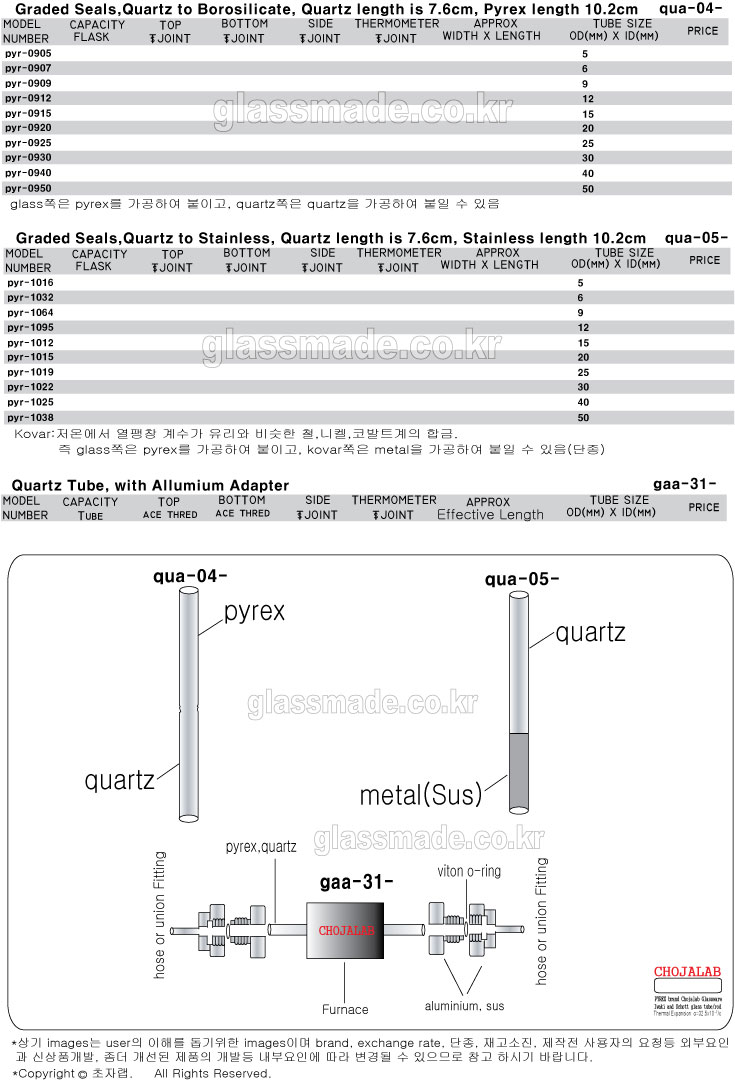 quartz tube / plate / flask / boat / crucible, graded seal(quartz & pyrex), general glass apparatus(일반초자기구), pyrex tube and quartz tube(유리관 및 석영관)