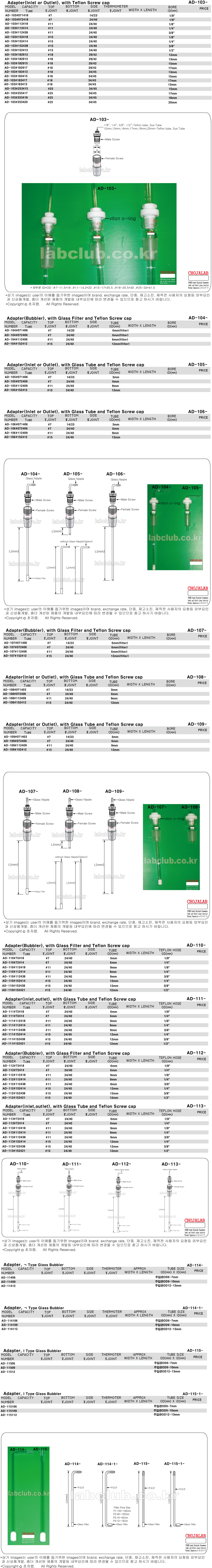 Adapter, Adapter with Teflon Screw Cap, Inlet Outlet Adapter, Adapter with Teflon Screw Cap and Glass Filter, Adapter with Bubbler, ㄱ Type Glass Bubbler,ㅣType Glass Bubbler, AD-103, AD-104-, AD-105, AD-106, AD-107, AD-108, AD-109, AD-110, AD-111, AD-112, AD-113, AD-114, AD-115, 어뎁터, 아답타,주입관용어뎁터, 버블러용어뎁터, 필터용어뎁터, 테프론튜브용어뎁터, 서스튜브용어뎁터, 그라스튜브용어뎁터,주입관용아답타, 버블러용아답타, 필터용아답타, 버블러