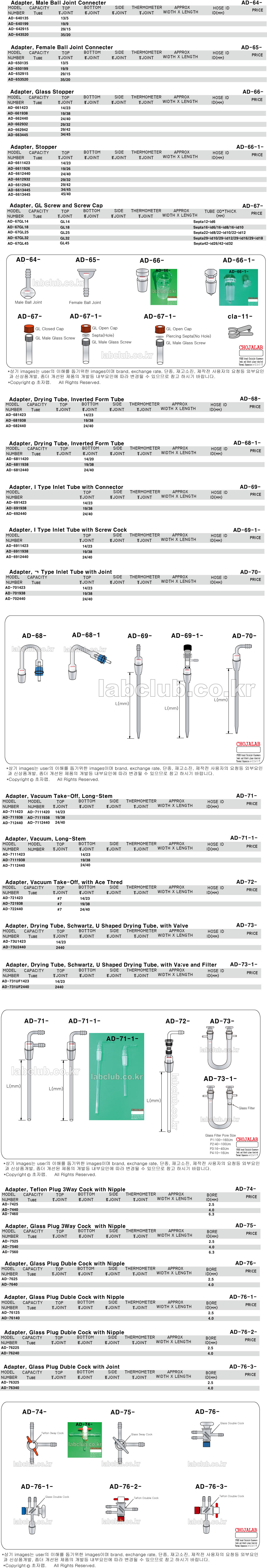 Adapter, Ball Joint Connecter, Glass Stopper, GL, GL Screw and Screw Cap, Drying Tube, Inverted Form Tube, Inlet Tube, Long-Stem Vacuum Take-Off, Teflon Plug 3Way Cock, Glass Plug 3Way Cock with Nipple, Duble Cock with Nipple, AD-64, AD-65, AD-66, AD-67, AD-68, AD-68-1, AD-69, AD-69-1, AD-70, AD-70-1, AD-71, AD-72, AD-73, AD-73-1, AD-74, AD-75, AD-76, AD-76-1, AD-76-2, AD-76-3, 어뎁터, 아답타, 볼쬬인트커넥터, 볼죠인트커넥터, 스토퍼, 그라스스토퍼, 스크류캡, 드라이튜브, 드라이닝튜브, 건조관, 주입관, 인넷튜브, 3웨이밸브, 3웨이진공밸브, 3방밸브, 3방진공밸브, 더블콕크, 따블콕크