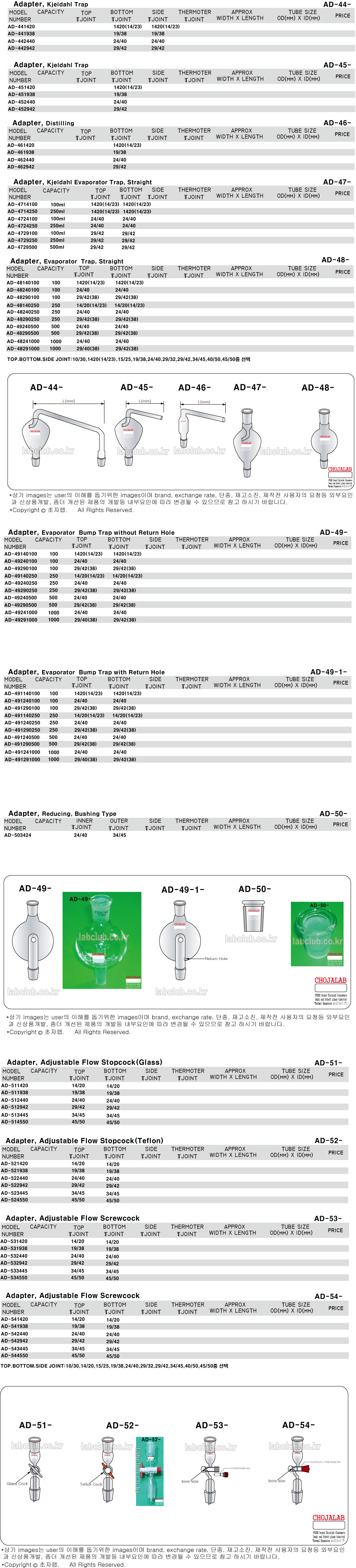 Adapter, Trap, Evaporator Trap, Distilling Trap, Distilling Adapter, Evaporator Bump Trap, Evaporator Trap with Return Hole, Evaporator Trap without Return Hole , Reducing Busing Adapter, Busing Adapter, Busing, Adjustable Flow Stop Cock, Stop Cock, AD-44, AD-45, AD-46, AD-47, AD-48, AD-49, AD-50, AD-51, AD-52, AD-53, AD-54,어뎁터, 아답타, 트랩, 에바프레타트랩, 에버프레터트랩, 회전농축용트랩, 디스틸링트랩, 디스틸레이션트랩, 플로우스탑콕크, 스탑콕크, 밸브, 부싱, 축소어뎁터, 축소아답타