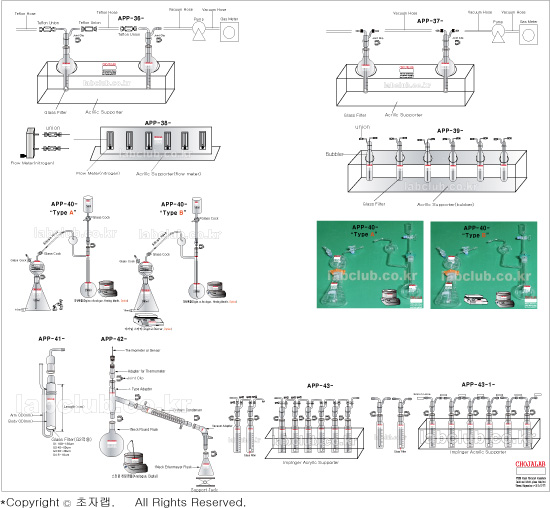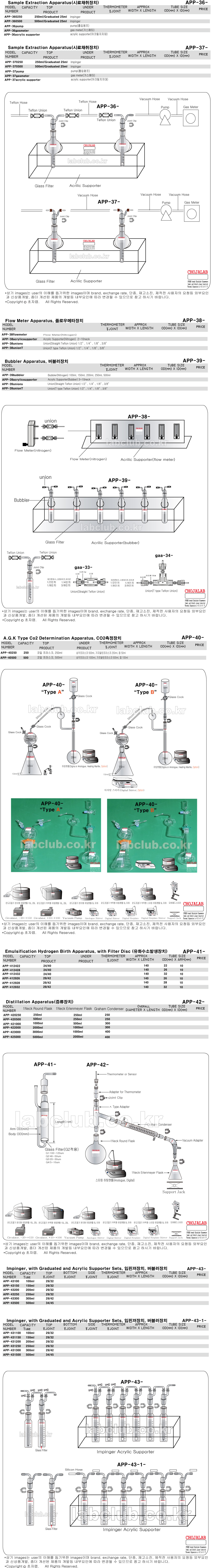 Apparatus, Sample Extraction Apparatus, Flow Meter Apparatus, Bubbler Apparatus, Impinger, with Graduated and Acrylic Supporter Sets, with Graduated and Acrylic Supporter Sets, A.G.K Type Co2 Determination Apparatus, Emulsification Hydrogen Birth Apparatus, with Filter Disc, Distillation Apparatus, APP-36, APP-37, APP-38, APP-39, APP-40, APP-41, APP-40, APP-43, APP-43-1, 시료채취장치, 샘플채취장치, 플로우메타장치, 임핀져장치, 버블러장치, CO2측정장치, 유화수소발생장치, 증류장치, 그라스장치, 유리실험장치, 장치