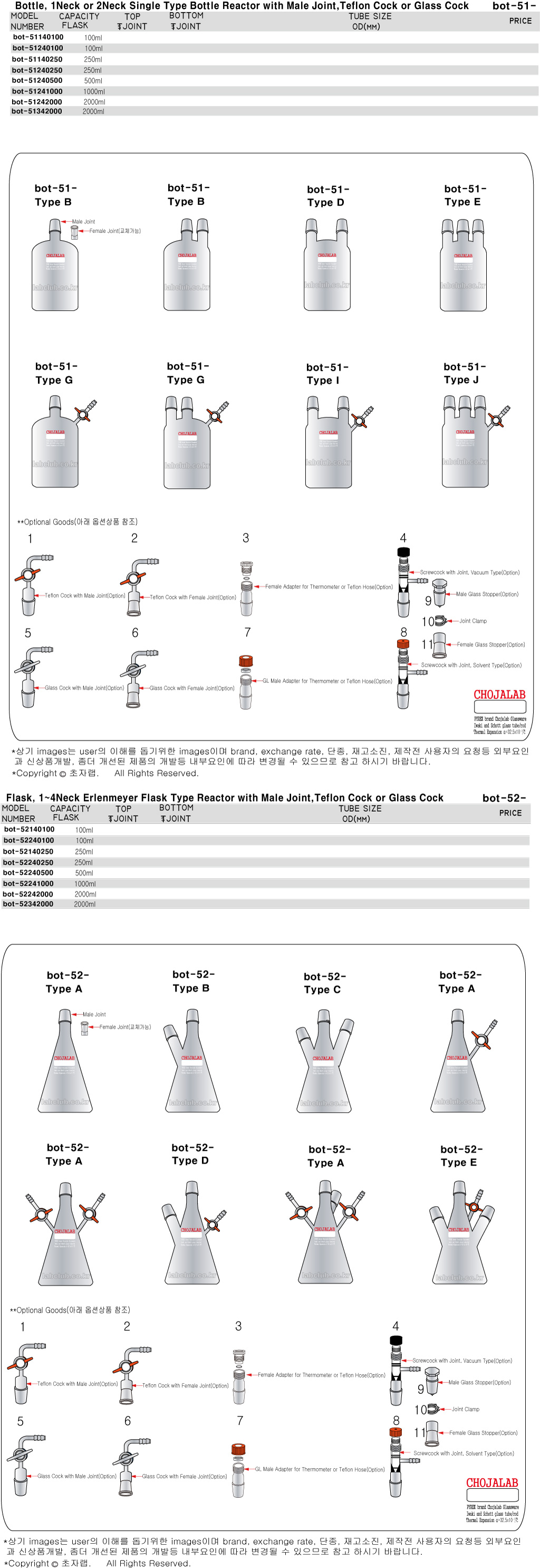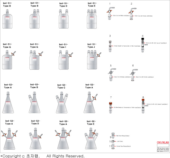 Bottle, 1Neck or 2Neck Single Type Bottle Reactor with Male Joint,Teflon Cock or Glass Cock, Flask, 1~4Neck Erlenmeyer Flask Type Reactor with Male Joint,Teflon Cock or Glass Cock, bot-51, bot-52, 보틀, 보틀반응조, 보틀반응기, 플라스크, 플라스크반응조, 삼각플라스크, 삼각플라스크, 삼각플라스크반응조, 삼각플라스크반응기