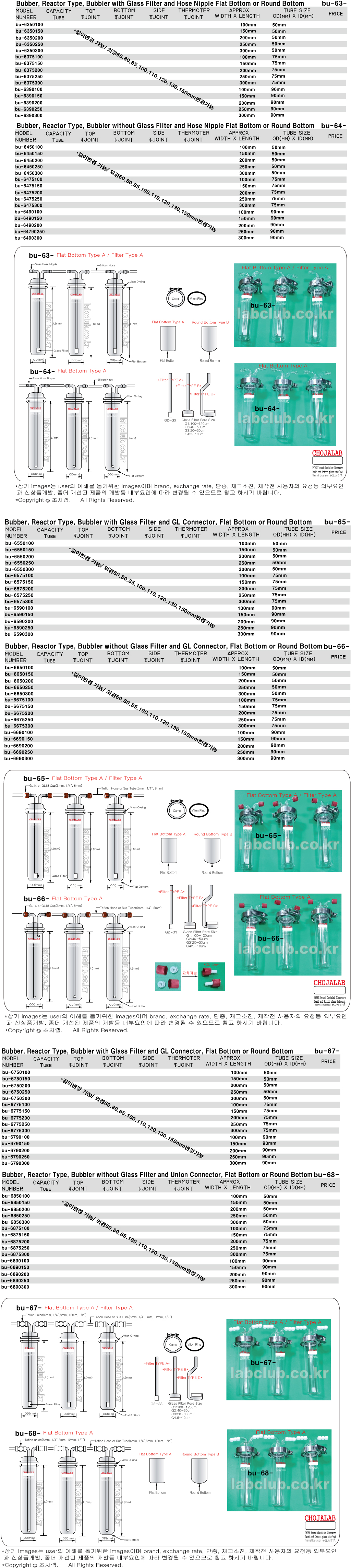 Bubbler, Reactor Type Bubbler, Bubbler with Glass Filter and Hose Nipple, Round Bottom or Flat Bottom, Bubbler without Glass Filter and Hose Nipple, Type A, Type B , bu-63, bu-64, bu-65, bu-66, bu-67, bu-68, 버블러, 리엑터타입버블러, 반응조타입버블러