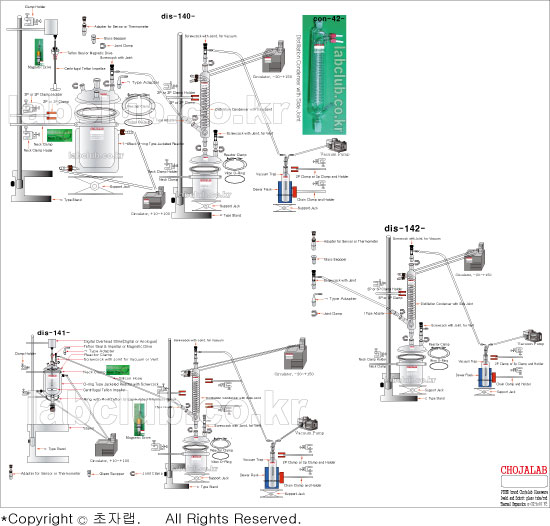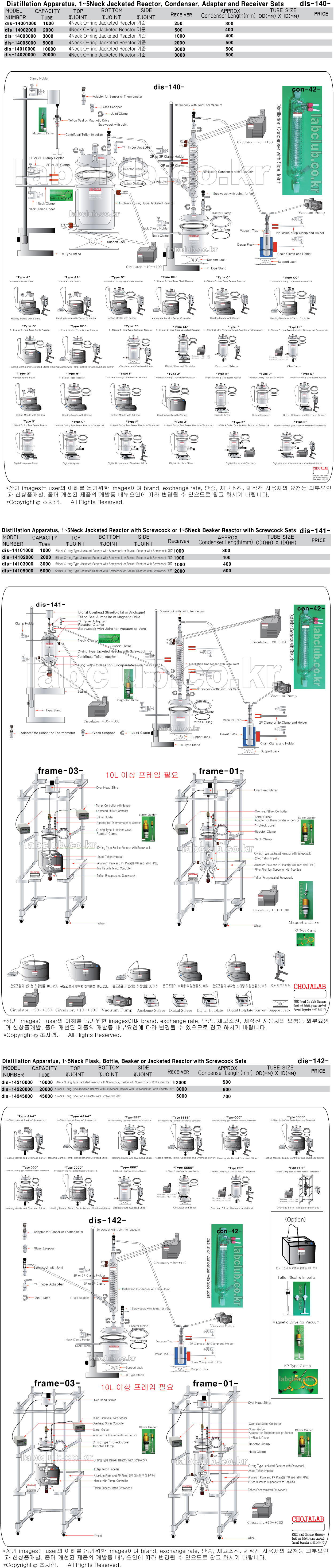 Distillation Apparatus, 1~5Neck Jacketed Reactor, Condenser, Adapter and Receiver Sets, 1~5Neck Beaker Reactor with Screwcock or Jacketed Reactor with Screwcock Sets, 1~5Neck Beaker Reactor with Screwcock or Jacketed Reactor with Screwcock Sets, dis-140, dis-141, dis-142, 디스틸레이션장치, 증류장치, 증류수장치, 디스틸링장치, 디스틸링컬럼장치