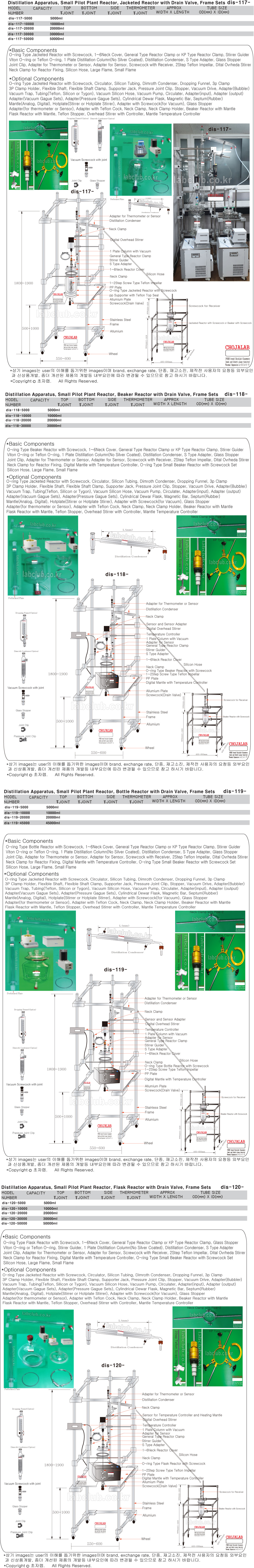Distillation Apparatus, Small Pilot Plant Reactor, Jacketed Reactor with Drain Valve, Beaker Reactor with Drain Valve, Bottle Reactor with Drain Valve, Flask Reactor with Drain Valve, Frame Sets, Distillation Column, Distilling Column, dis-117, dis-118, dis-119, dis-120, 디스틸레이션장치와프레임, 디스틸링장치와프레임, 증류장치와프레임, 증류장치, 디스틸레이션장치, 디스틸링장치, 디스틸링컬럼, 디스틸링콘덴서