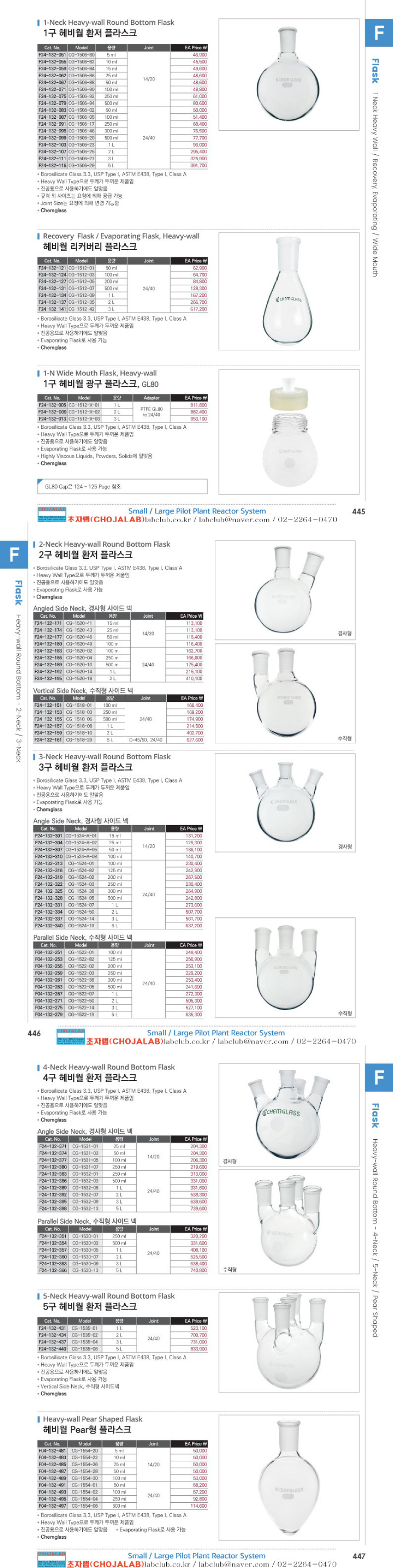 F24-132, 445, 446, 447, Flask, 1-6Neck Heavy Wall Round Bottom Flask, Heavy Wall Recovery Flask, Evaporating Flask, 1-Neck Heavy Wall Mouth Flask, 플라스크, 1구헤비월플라스크, 2구헤비월플라스크, 3구헤비월플라스크, 4구헤비월플라스크, 5구헤비월플라스크, 1구헤비월광구플라스크, 1구~6구 헤비월환저 플라스크, 헤비월 리커버리 플라스크, pear형플라스크, 리커버리플라스크
