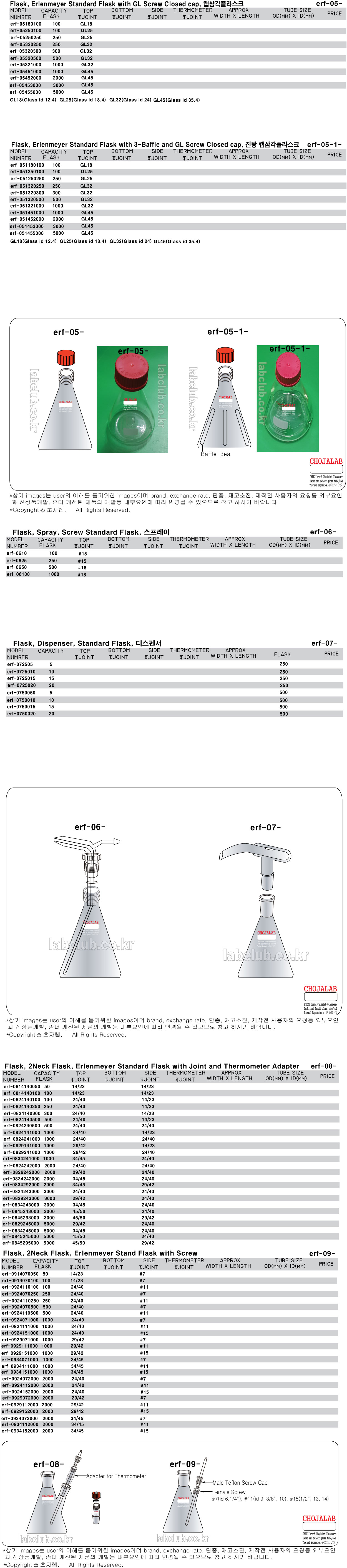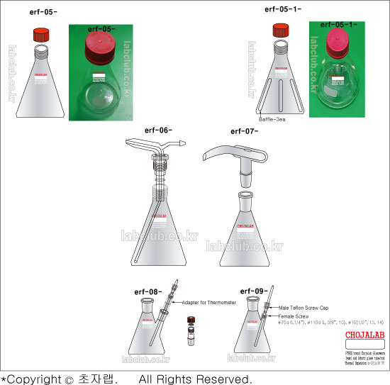 Flask, Erlenmeyer Standard Flask with GL Screw Closed cap, Erlenmeyer Standard Flask with 3-Baffle and GL Screw Closed cap, Spray, Screw Standard Flask, Dispenser, 2Neck Flask, Erlenmeyer Standard Flask with Joint and Thermometer Adapter, erf-05, erf-05-1, erf-06, erf-07, erf-08, erf-09, 캡삼각플라스크, 진탕캡삼각플라스크, 진탕삼각플라스크, 베플삼각플라스크, 삼각프라스크, 삼각플라스크, 삼각프라스크, 스프레이, 디스펜서, 2구삼각플라스크