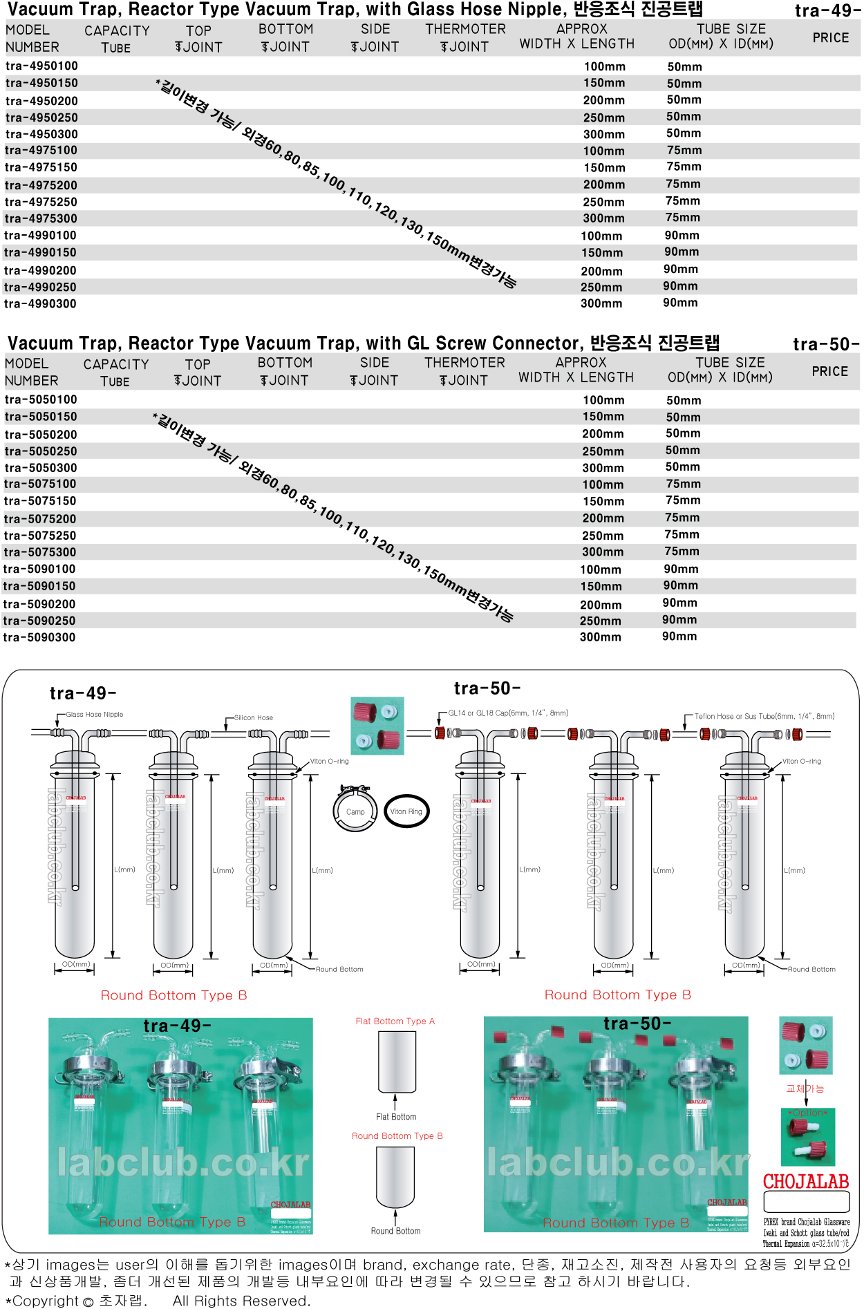 Trap, Vacuum Trap, Reactor Type Vacuum Trap, with Glass Hose Nipple or GL Screw Connector, tra-49, tra-50, 반응조식진공트랩, 반응조식트랩, 분리형진공트랩, 분리형트랩, 트랩, 진공트랩, 버블러, 임핀져, 임핀저