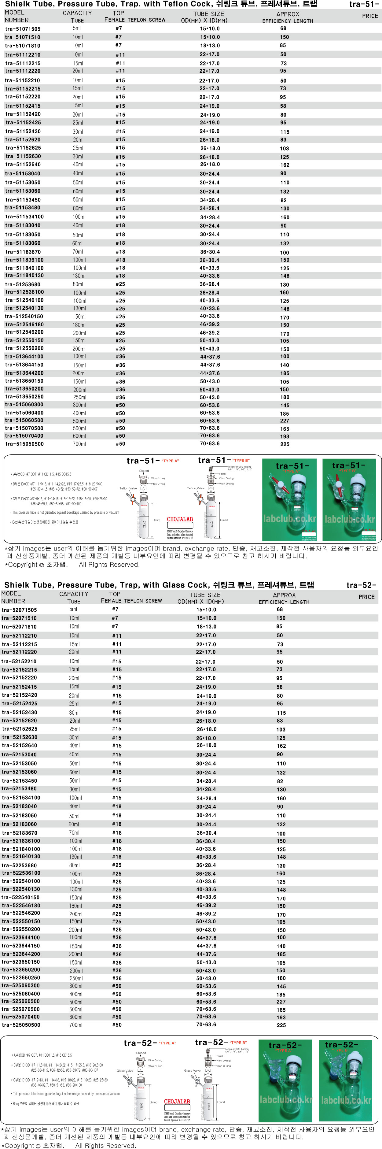 Shielk Tube, Pressure Tube, Seal TubeTrap, with Teflon Cock or Glass COCK, tra-51, tra-52, tra-51 TYPE A, tra-52 TYPE A, tra-51 TYPE B, tra-52 TYPE B, 쉬링크튜브, 트랩, 프레셔튜브, 압력병, 실튜브, 씰튜브